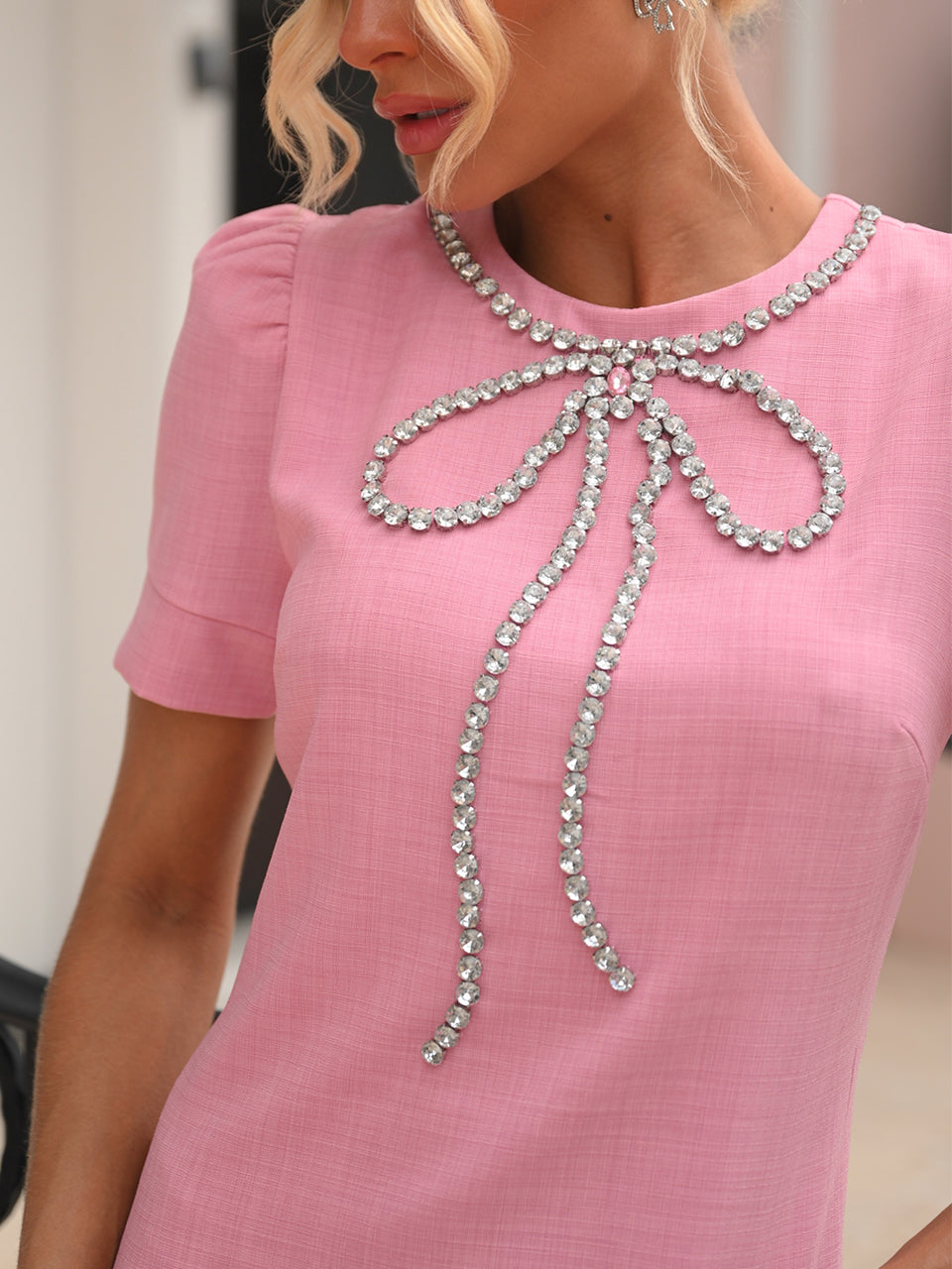 Charm Pink Crepe Short Dress with Appliqued Crystal Bow