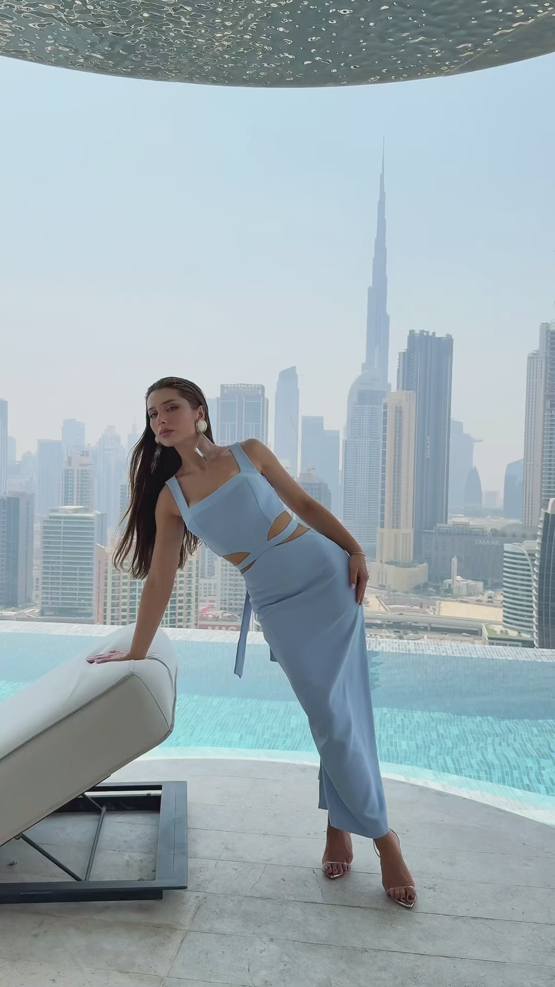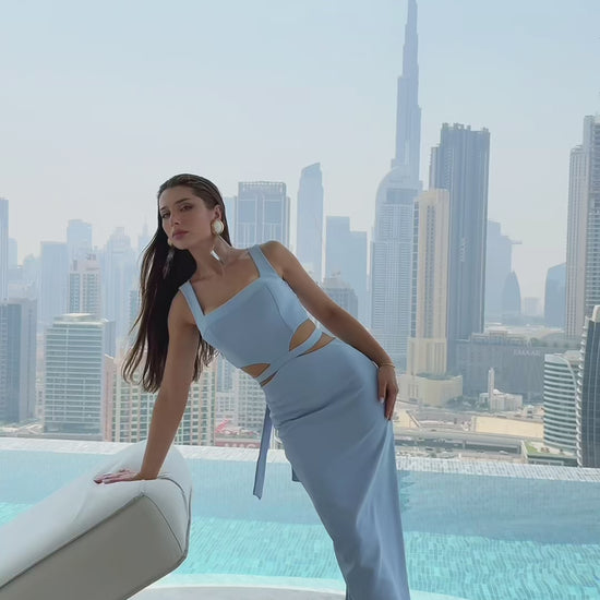 Serenity Blue Crepe Midi Dress with Cutouts at the Waist and Wide Riviera Cut-Out Straps