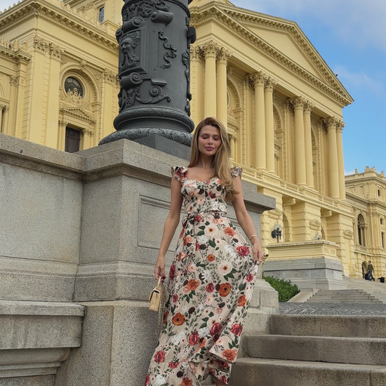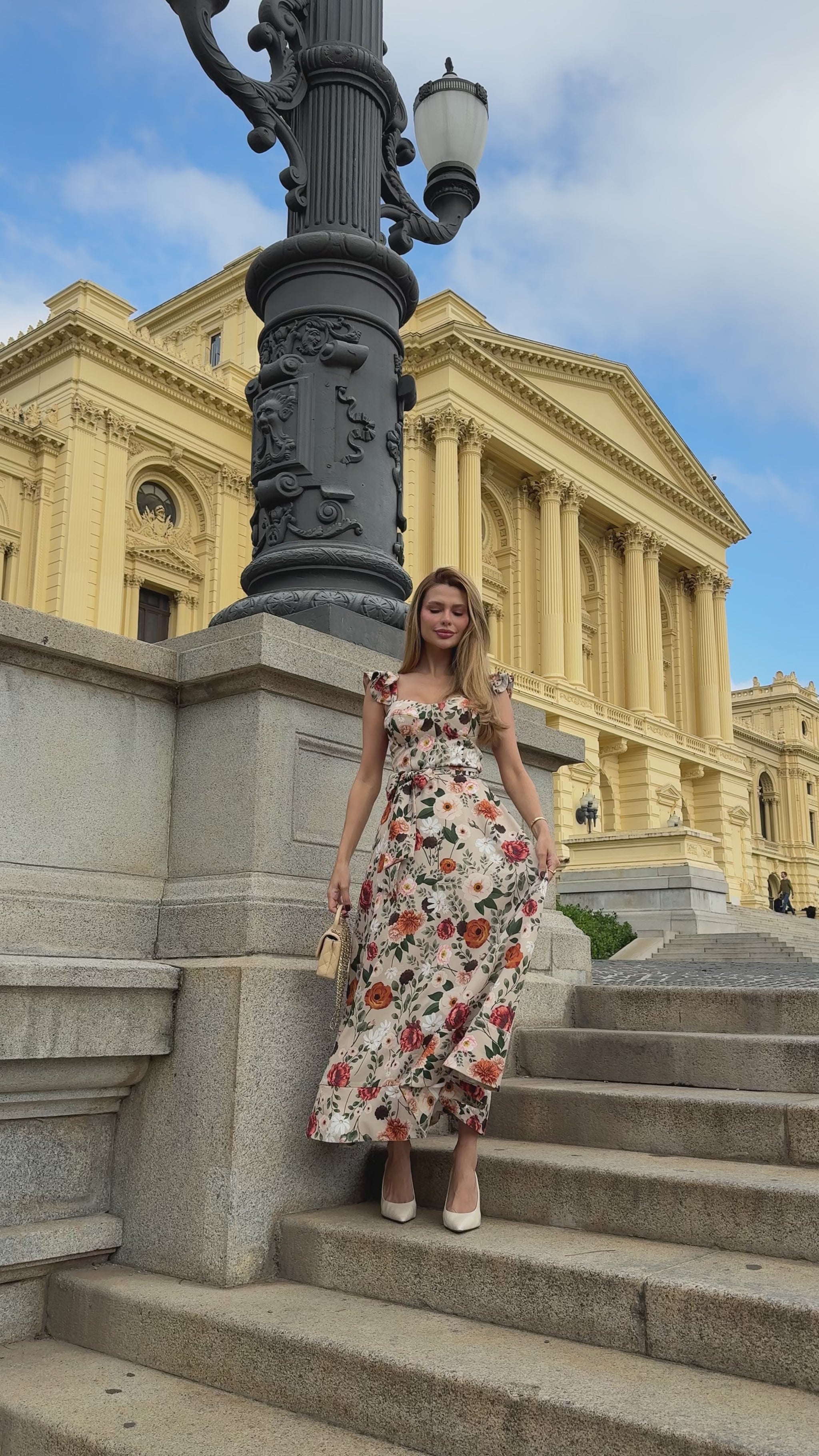 The floral midi dress is that look that never goes out of style. With an exclusive print, delicate hem, and ruffled straps, it embodies the brand's romantic DNA in every detail. The neckline with demi-cup cups enhances the bust with ease, and the tie strap at the waist adds a charming finishing touch. A metal zipper closure at the back ensures a flawless fit. A timeless floral that pairs well with special occasions, formal looks, or a stylish weekend lunch.