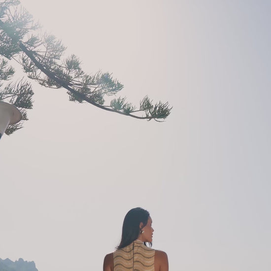 Descripción técnica: Vestido midi de algodón bordado con forro interior. Presenta escote alto con lazo, silueta ajustada y falda amplia con caída fluida. El bordado de ondas en dorado y negro crea un efecto visual sofisticado y moderno. Cierre trasero con cremallera metálica.