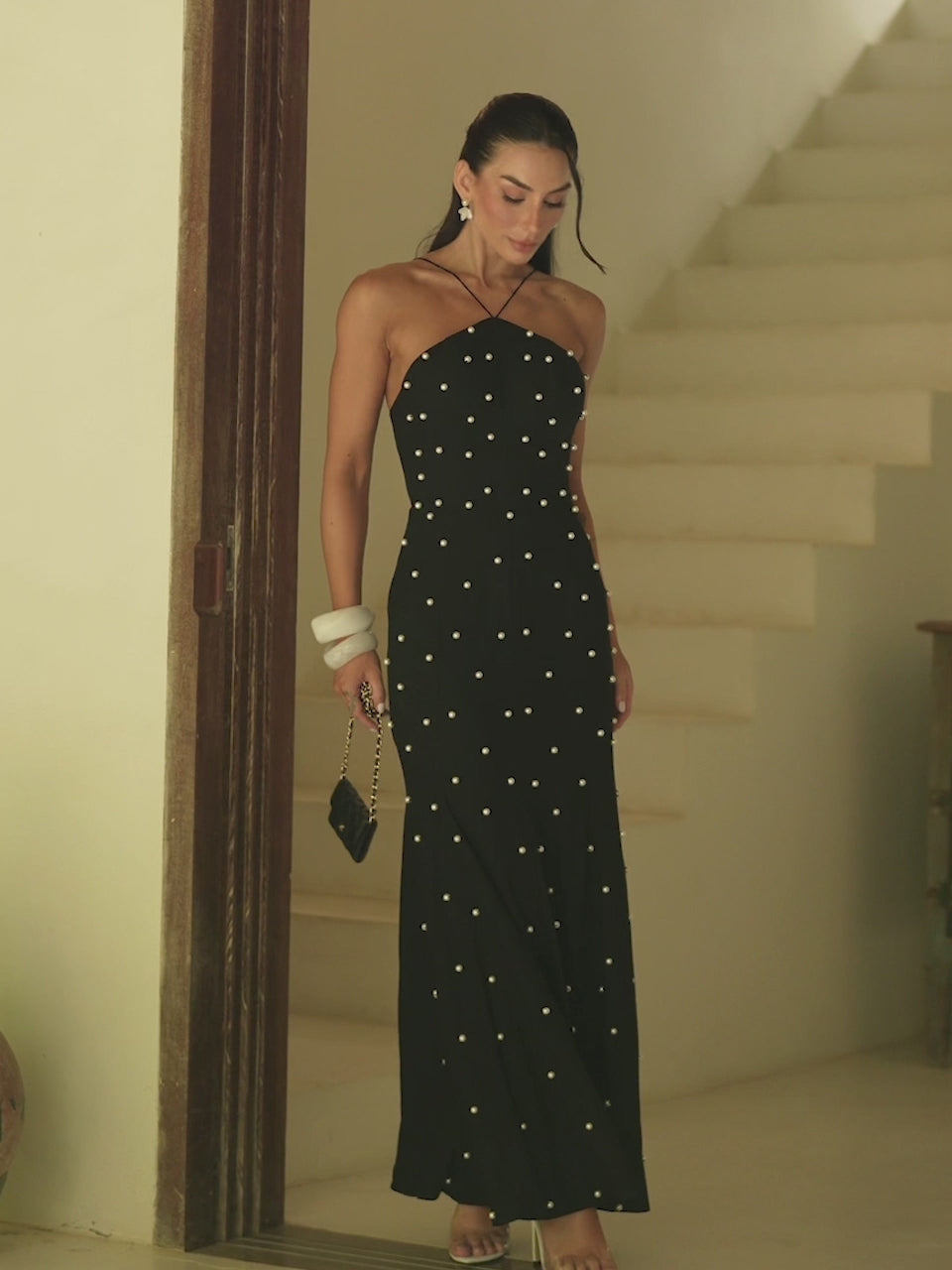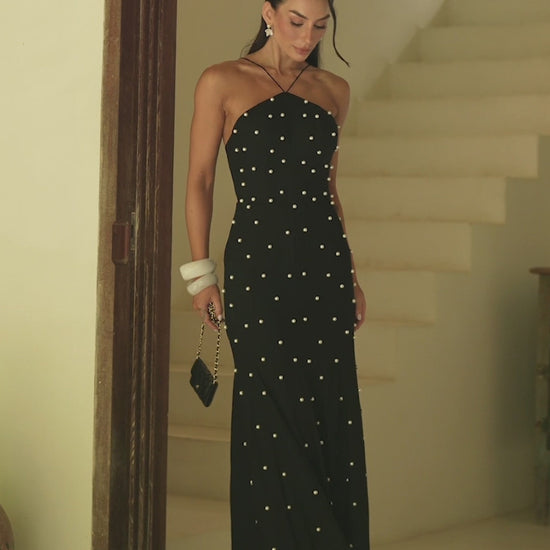 Vestido Preto Longo com Bordados Pérola Pearl Glam
