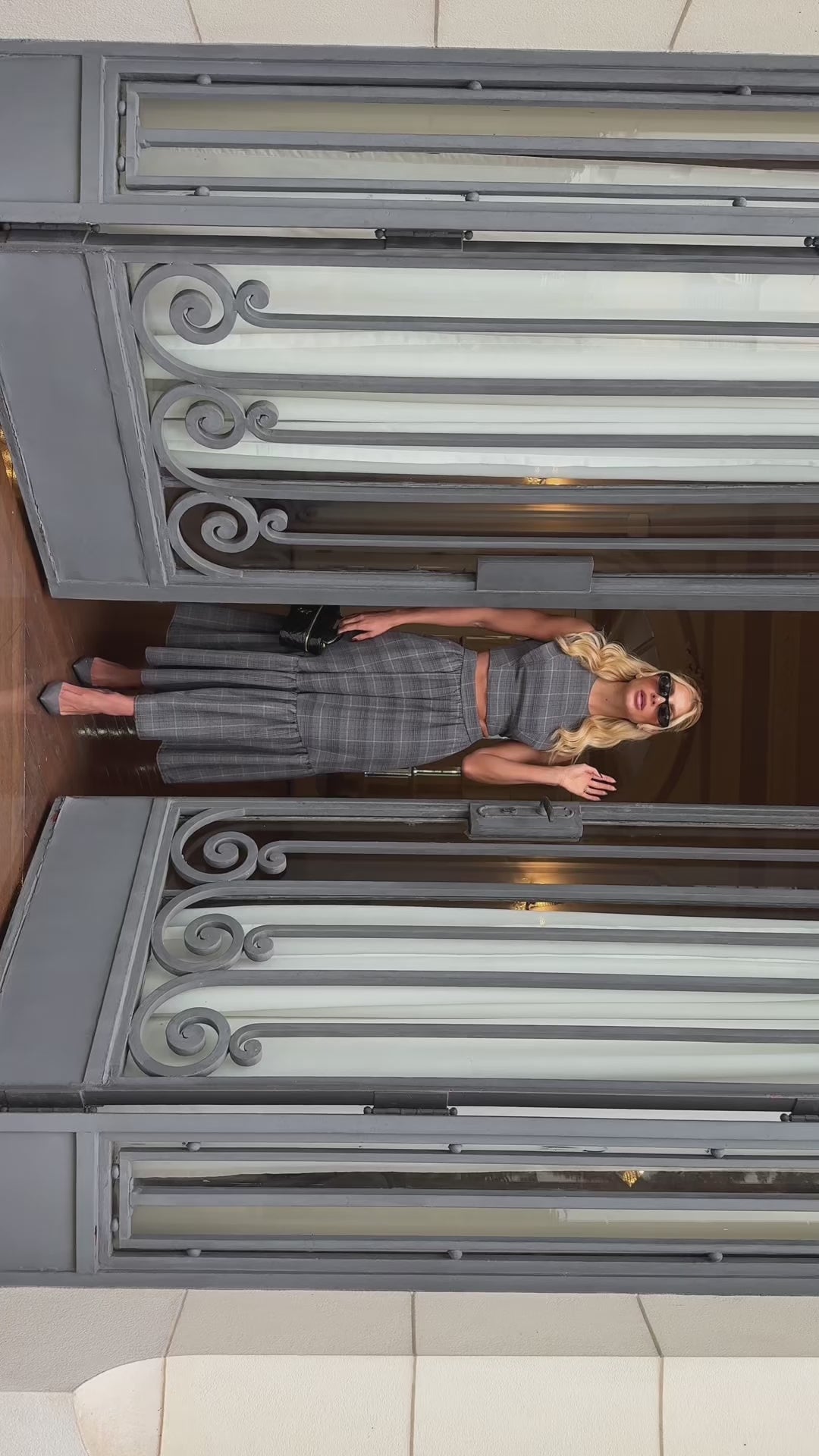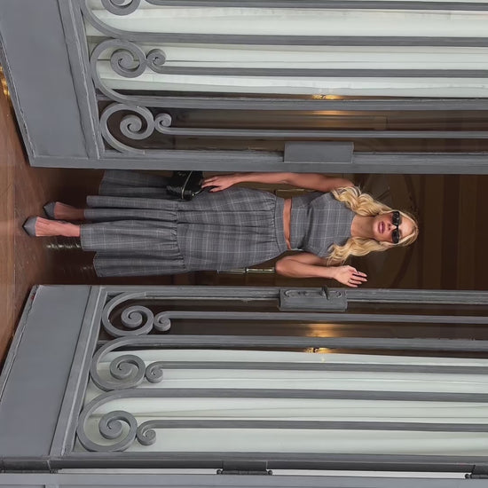 Conjunto composto por cropped e saia midi confeccionados em poliviscose com leve elasticidade e estampa xadrez clássica. O cropped possui modelagem ajustada, sem mangas, gola careca e fechamento posterior com zíper de metal. A saia tem cintura alta, cós franzido, bolsos laterais embutidos e recorte com babado amplo na barra, criando movimento fluido e moderno. Ideal para produções urbanas com toque sofisticado.