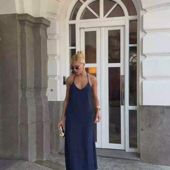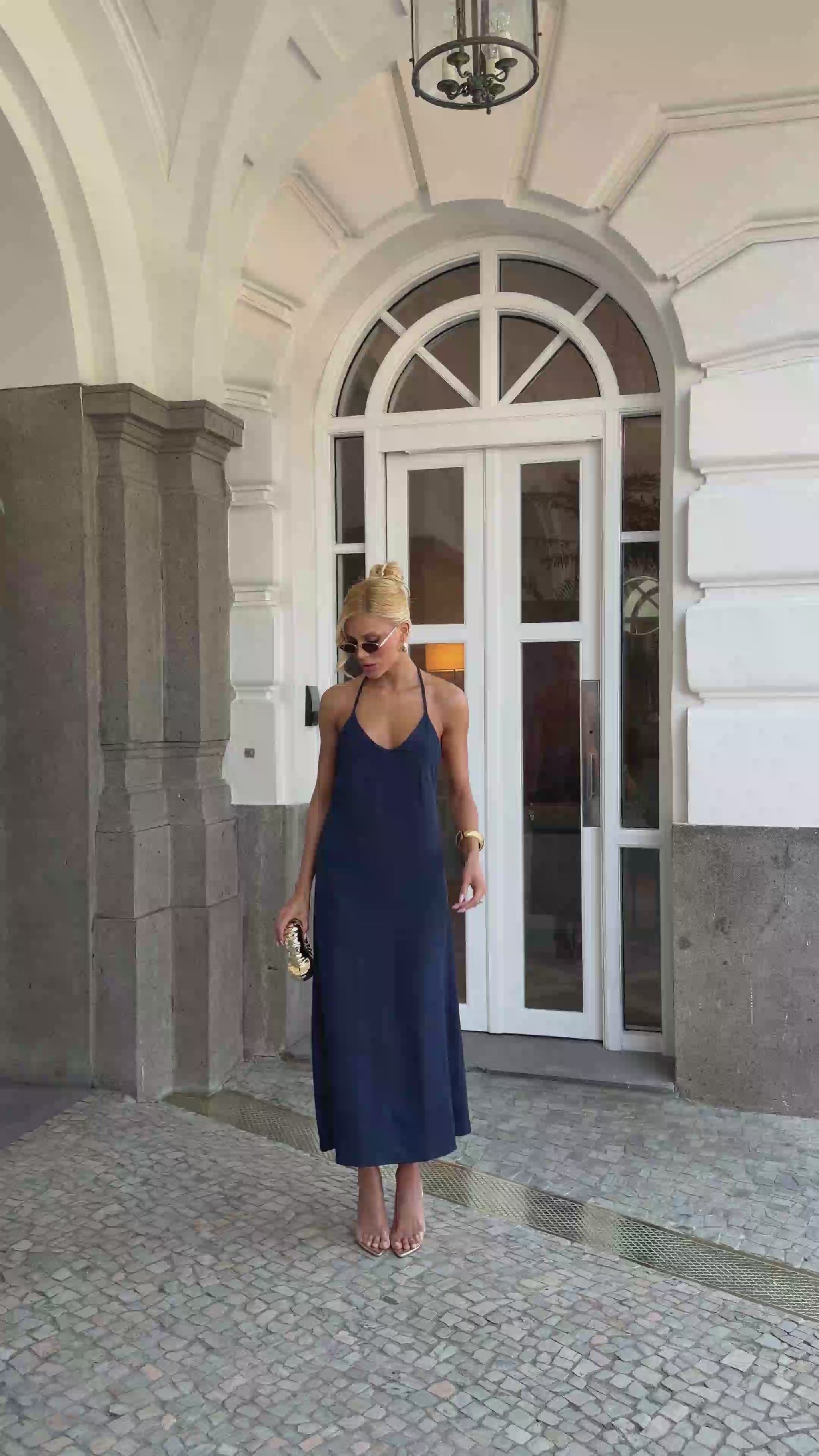 Slip Dress Midi Halter Navy Azul Marinho Com Broche