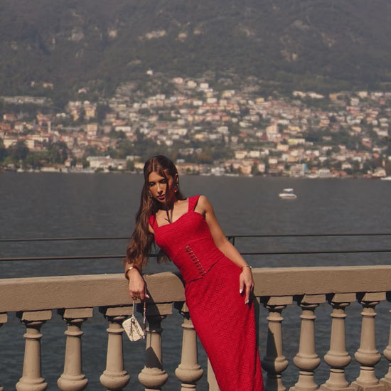 O Vestido Midi de Renda Vermelho Bella di Milano traz decote reto com alças largas, corpete estilo espartilho com abotoamento frontal metálico e modelagem ajustada que realça a cintura com sofisticação. Confeccionado em renda estruturada, o modelo une feminilidade e força em um visual inesquecível. Fechamento por zíper de metal nas costas.