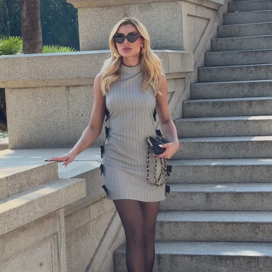 Alfaiataria nunca foi tão cool. Esse vestido curto risca de giz cinza vem com uma modelagem justa e gola alta que exala poder. O recorte cavado equilibra a estrutura impecável com um toque fresh, e os laços de veludo preto na lateral quebram a seriedade de um jeito super fashionista. O zíper de metal nas costas arremata tudo com aquele acabamento pratico.