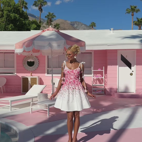 O Vestido Curto Rosa Jardim Dream é feito em crepe com toque macio e caimento leve. A estampa floral exclusiva concentra-se no busto e se dissolve em degradê pela saia off white, enquanto as alças de amarrar com ponteiras em pétalas reforçam o mood delicado. O busto estruturado valoriza a silhueta, a saia evasê garante movimento e o zíper de metal nas costas finaliza com acabamento seguro.