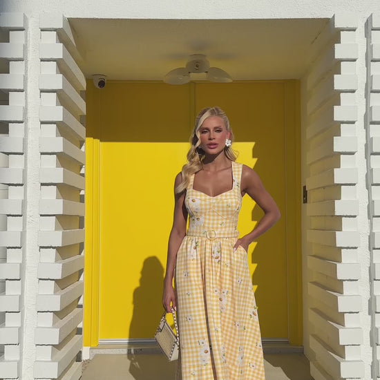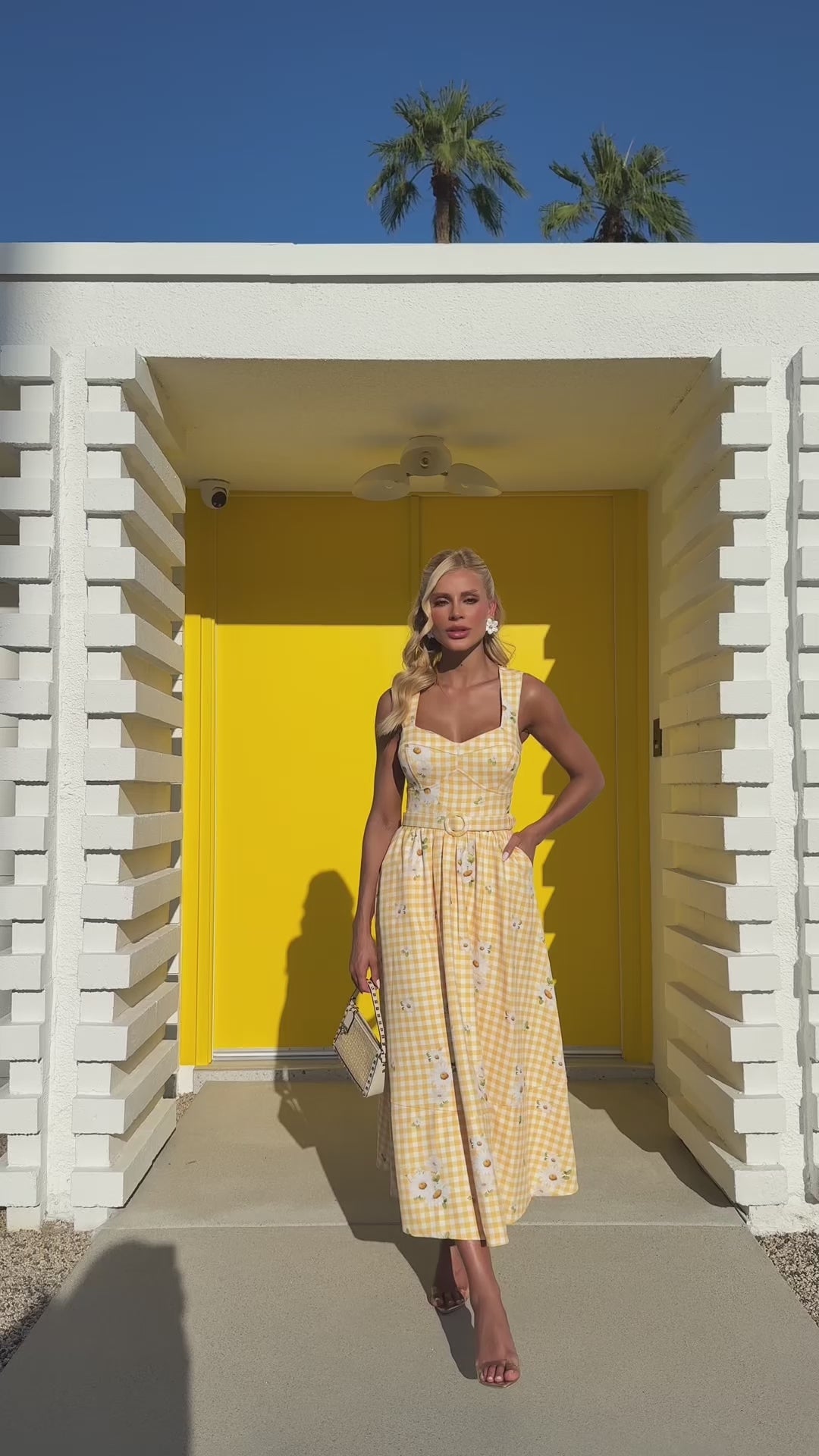 O Vestido Midi Amarelo Jardim Vichy é confeccionado em crepe com elastano, garantindo conforto e caimento leve. O busto estruturado valoriza a silhueta, possui bolso lateral e cinto forrado com fivela marcando a cintura. A estampa vichy amarela com flores delicadas traz o mood romântico e solar da temporada. O zíper de metal nas costas finaliza o look.