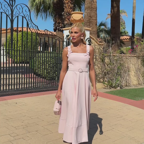 Confeccionado em crepe estruturado, este vestido midi possui modelagem acinturada que realça a silhueta, com saia ampla e fluida para um caimento impecável. O busto conta com aplicações florais 3D nos ombros, adicionando charme artesanal, e acompanha cinto forrado com fivela de pérolas, reforçando a sofisticação da peça. O fechamento é feito por zíper de metal nas costas.
