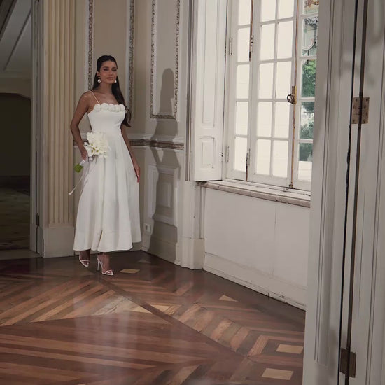Vestido midi em crepe off white com modelagem acinturada e saia evasê de caimento elegante. O busto estruturado valoriza o colo com alças finas e decote reto adornado por aplicações de rosas feitas manualmente, criando um detalhe delicado e romântico. A saia ampla traz movimento e leveza ao visual, tornando a peça perfeita para cerimônias civis, pré-wedding ou celebrações especiais.