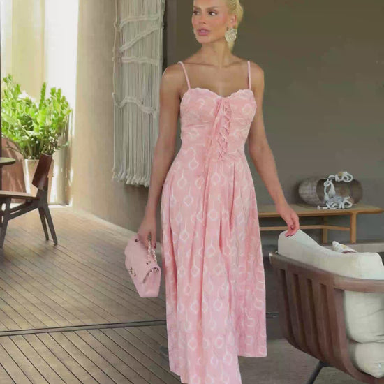 Modelo com decote corset, amarras frontais, alças finas e cintura marcada que valoriza a silhueta. A saia midi ampla traz caimento fluido e delicado, perfeita para produções elegantes e femininas. Confeccionado em laise bordada, com zíper de metal nas costas.
