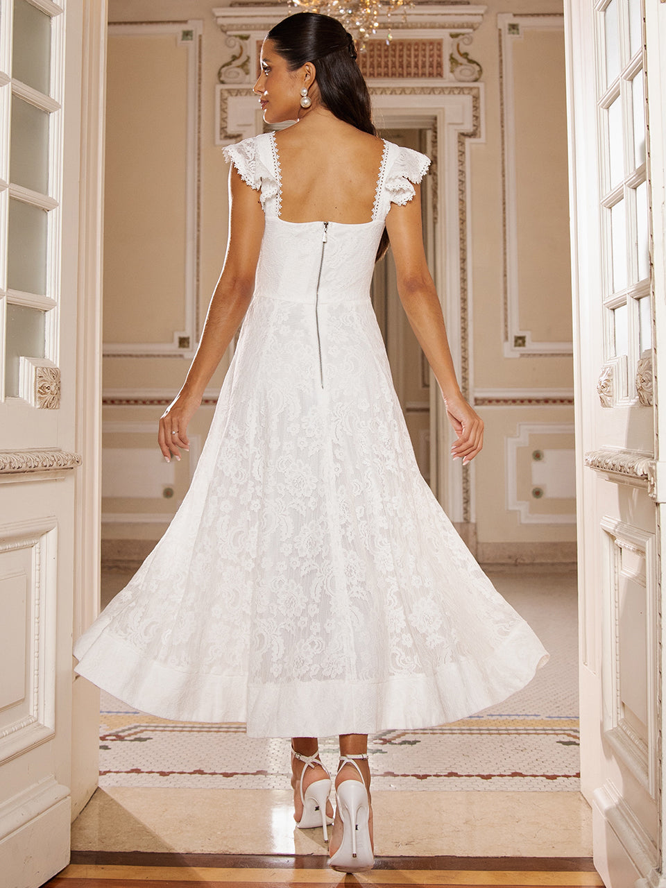 Vestido midi em renda branca com modelagem acinturada e saia evasê de movimento leve. O busto estruturado valoriza o colo, com decote coração e alças largas em renda com acabamento delicado. A saia em renda floral cria um visual romântico e elegante, ideal para ocasiões especiais, civil ou celebrações intimistas.