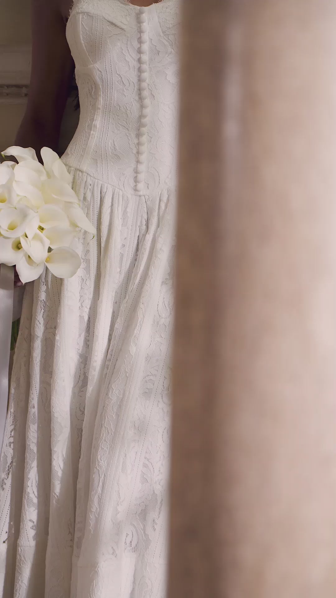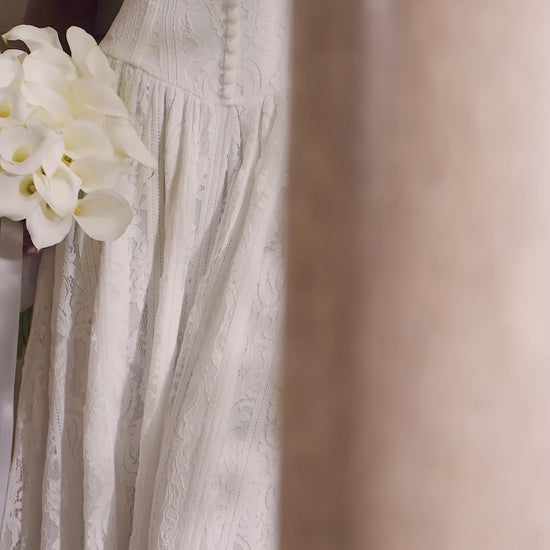 Vestido midi em renda off white com modelagem acinturada e saia evasê de movimento leve. O busto estruturado estilo corset valoriza a silhueta com recortes que realçam o colo, alças largas e abotoamento frontal decorativo. A saia em renda floral traz fluidez e romantismo à peça, criando um visual elegante e delicado, ideal para cerimônias civis ou celebrações especiais.
