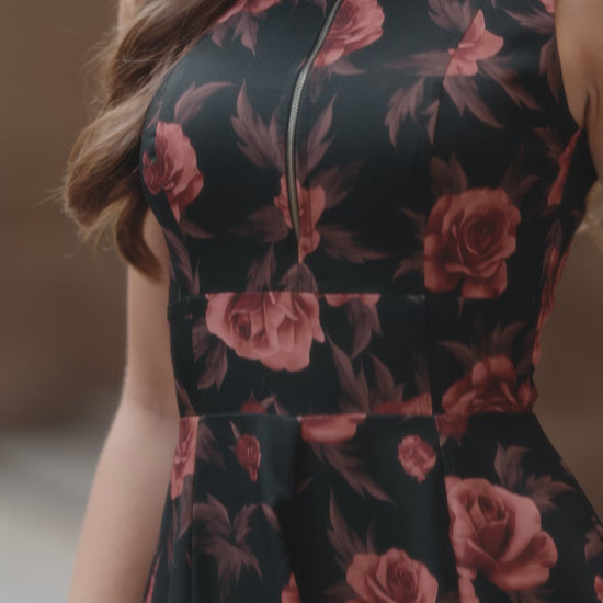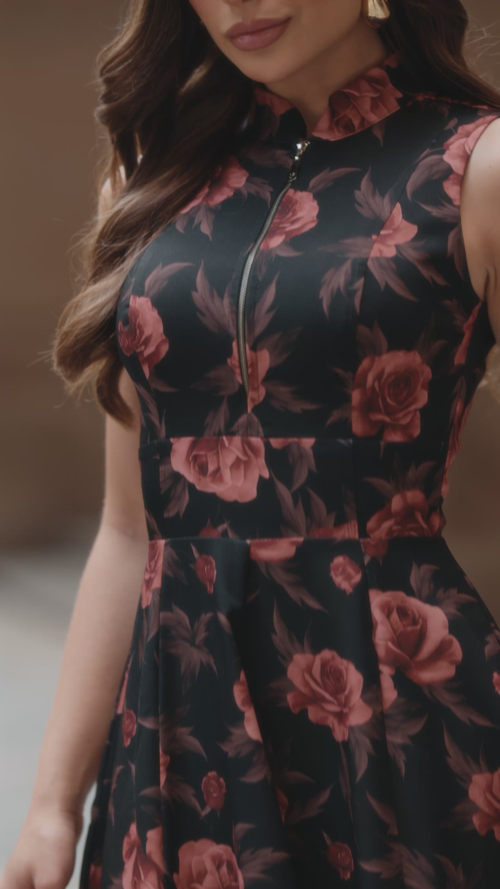 O Vestido Midi Floral com Fundo Preto traz a força do floral dramático, tendência que promete dominar o outono/inverno 2025. As flores em tons terrosos e quentes trazem aquele toque de ousadia, e o fundo preto intensifica a dramaticidade, deixando o visual ainda mais impactante. A modelagem godê com recortes celebra o romantismo com uma pegada moderna e cheia de personalidade, trazendo o equilíbrio perfeito entre fluidez e estrutura. O decote gola alta com zíper frontal é um aceno às silhuetas futuristas que continuam em alta, e o zíper de metal nas costas adiciona aquele toque industrial, que também é uma tendência forte.