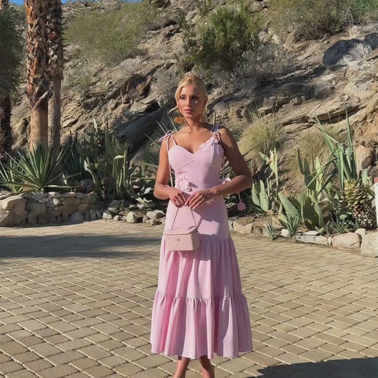O Vestido Midi Laço Garden Rosa é perfeito para ocasiões especiais com um toque feminino e sofisticado. Confeccionado em crepe, possui decote coração e alcinhas ajustáveis com amarração em laço, que reforçam a delicadeza da peça. O busto é adornado por flores aplicadas em relevo e a saia em camadas levemente franzidas cria movimento leve. O zíper de metal nas costas completa o acabamento com modernidade.