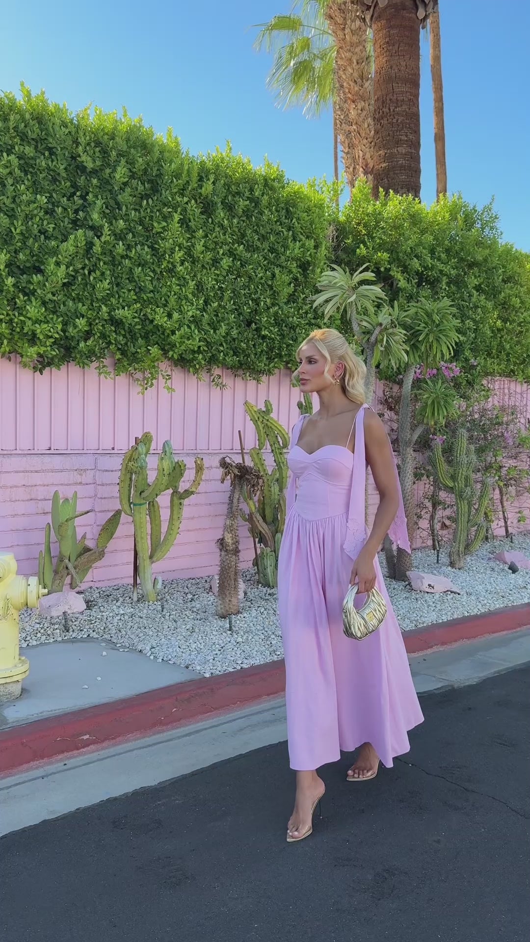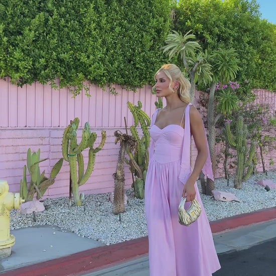 O Vestido Midi Rosa Laço Bloom é confeccionado em viscolinho, unindo o toque natural do linho com a fluidez da viscose. O busto estruturado valoriza a silhueta, enquanto as alças finas com laços longos e aplicações de flores bordadas trazem delicadeza artesanal à peça. A saia ampla garante movimento leve e o zíper de metal nas costas finaliza com elegância.